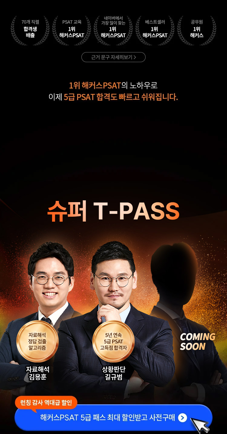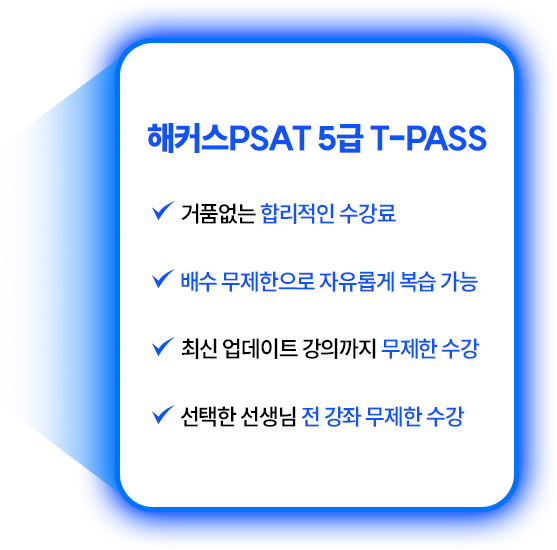 ※ 해커스PSAT 5급 T-PASS는 원하는 스타선생님의 5급 PSAT 전 강좌를 무제한 수강할 수 있는 상품입니다.