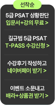 1. 해커스PSAT 사이트에 수강후기 1건 작성시 추첨을 통해 스타벅스 아메리카노(T)가 제공됩니다.