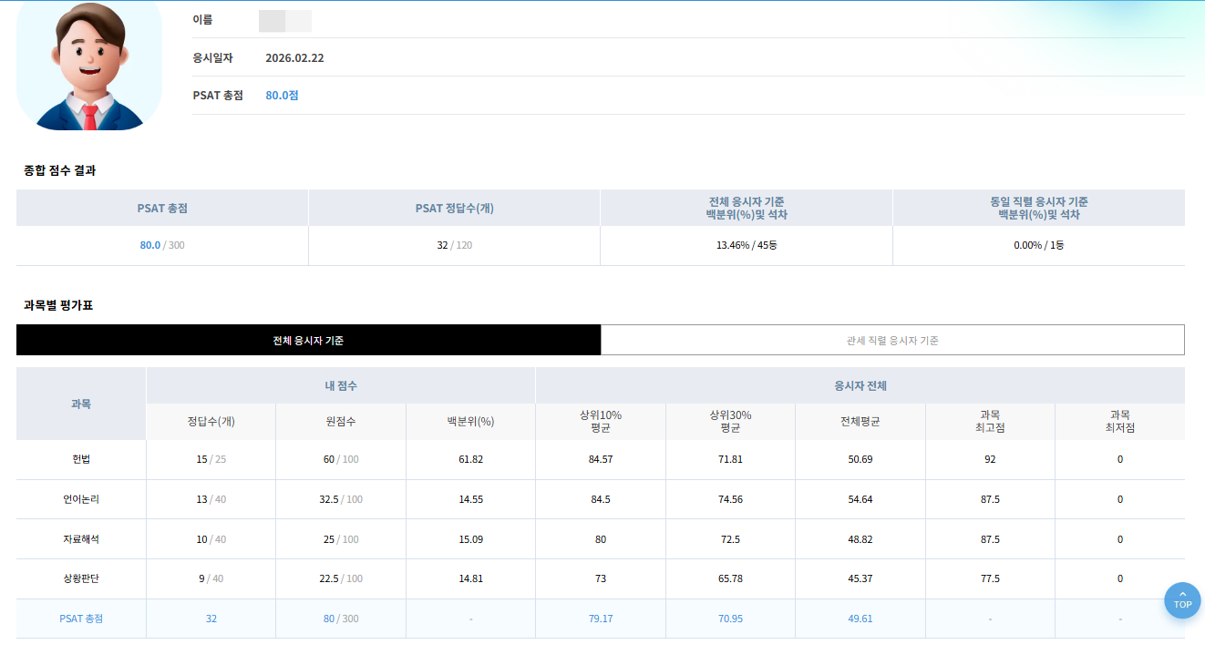이번에 해커스 PSAT 3회 모의고사에 응시하게 되었습니다. 본 시험을 앞두고 연습의 필요성을 느꼈고, 실제 시험과 최대한 비슷한 환경에서 한 번쯤 점검이 필요하다고 판단해 신청하게 되었습니다. 시험 당일에는 실제 시험과 같은 시간 흐름 속에서 진행되어, 시작 전부터 자연스럽게 긴장감이 형성되었고 문제에 몰입할 수 있는 분위기가 잘 조성되어 있었습니다.