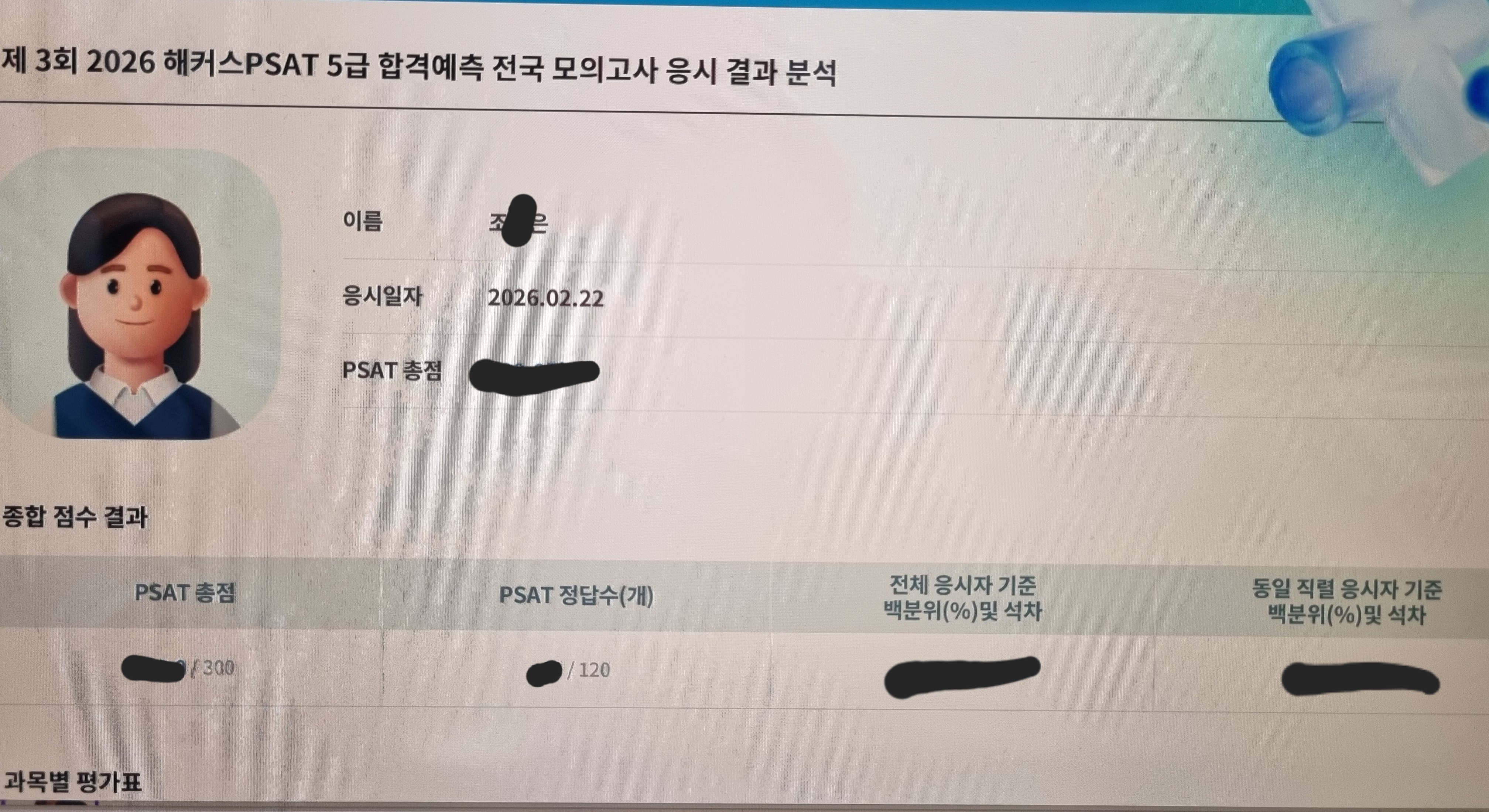 해커스 PSAT 5급 전국모의고사 3회에 응시하였습니다. 시험 2주일을 앞두고 실제 시험과 동일하게 연습할 수 있는 좋은 기회였습니다. 감독관님께서 시험 설명도 친절하게 해주셔서 매끄럽게 잘 진행되었습니다.